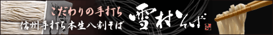 「雪村そば」は、こだわりの味をお届けしたく、 信州産など国内産のそば粉で打ち上げた、本生二八そばです。また、保存料等の添加物は一切使用してない、本物の生そばでございます。 |